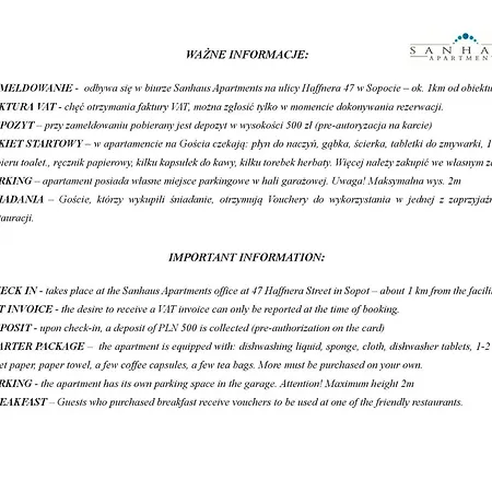 Neben den Annehmlichkeiten für Selbstversorger, darunter eine Küchenzeile, bietet die Unterkunft seinen Gästen einen Essbereich im Freien. Der nächstgelegene Flughafen Danzig-Lech Walesa ist 5 km von den Apartments entfernt, und die Bushaltestelle Sobieskiego - Przychodnia 02 ist ungefähr 200 Meter von der Unterkunft entfernt.